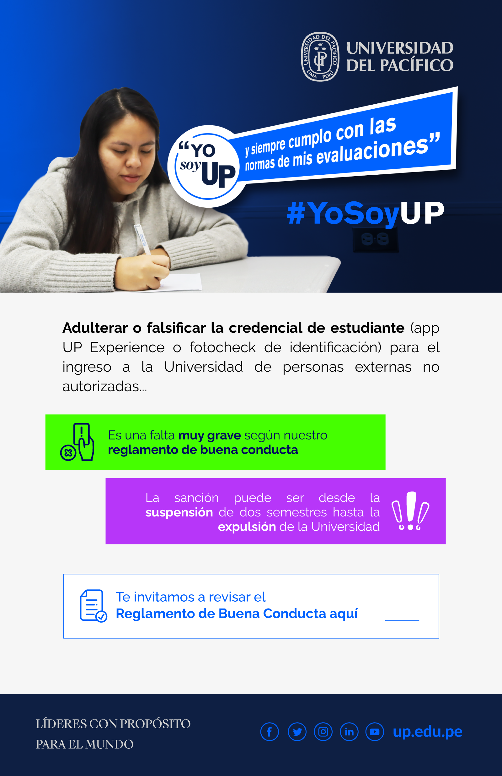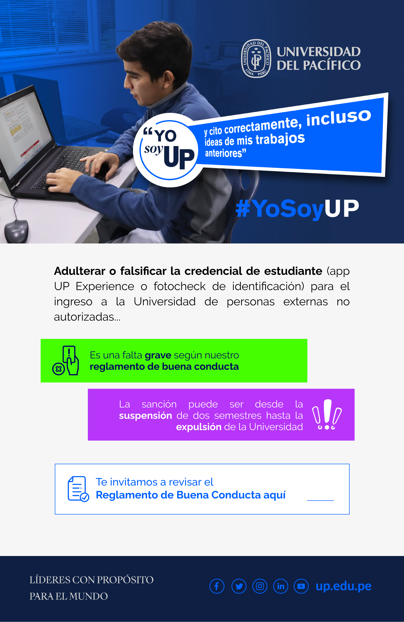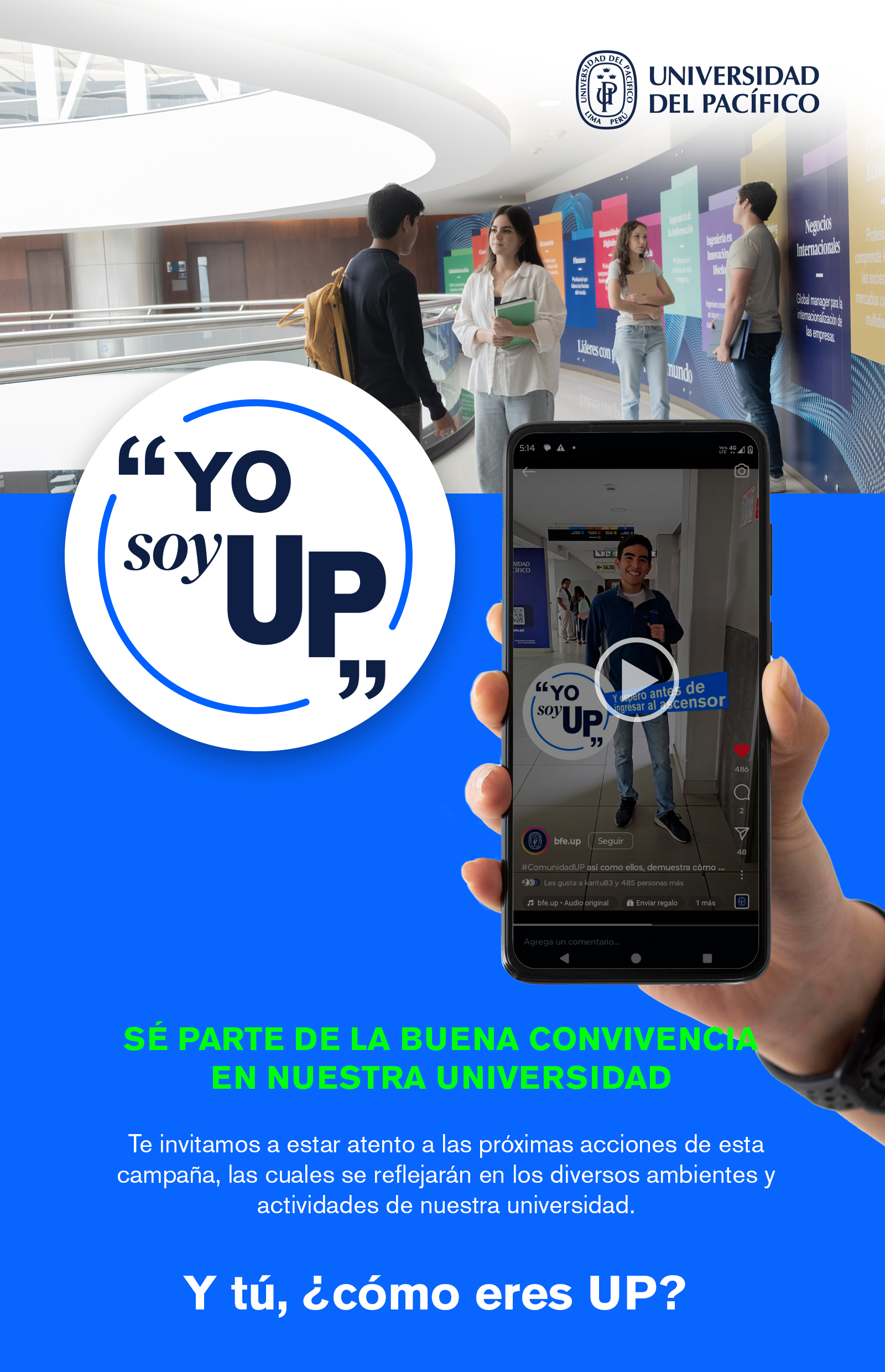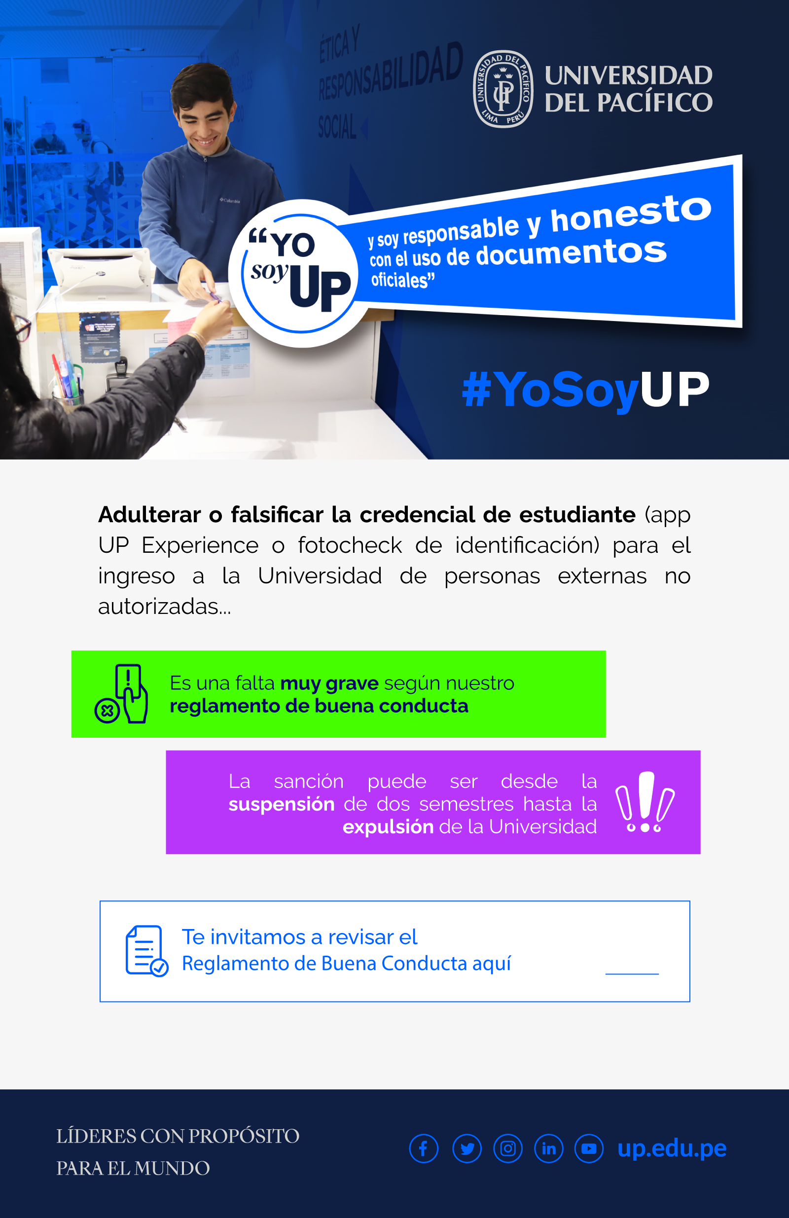 La campaña de integridad 2024 de la Universidad del Pacífico se difundió bajo el hashtag #YoSoyUP, con el propósito de reforzar el sentido de identidad y compromiso de los estudiantes con los valores que caracterizan a nuestra comunidad: Respeto al otro, Honestidad y veracidad, Libertad de pensamiento y opinión, y Responsabilidad social.