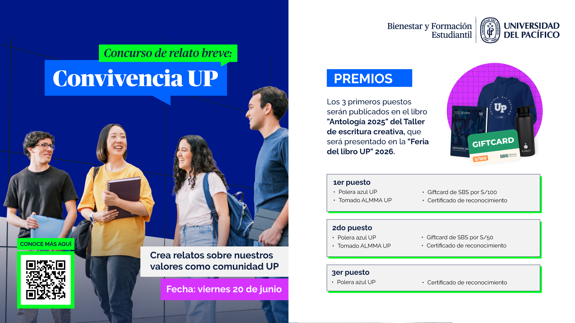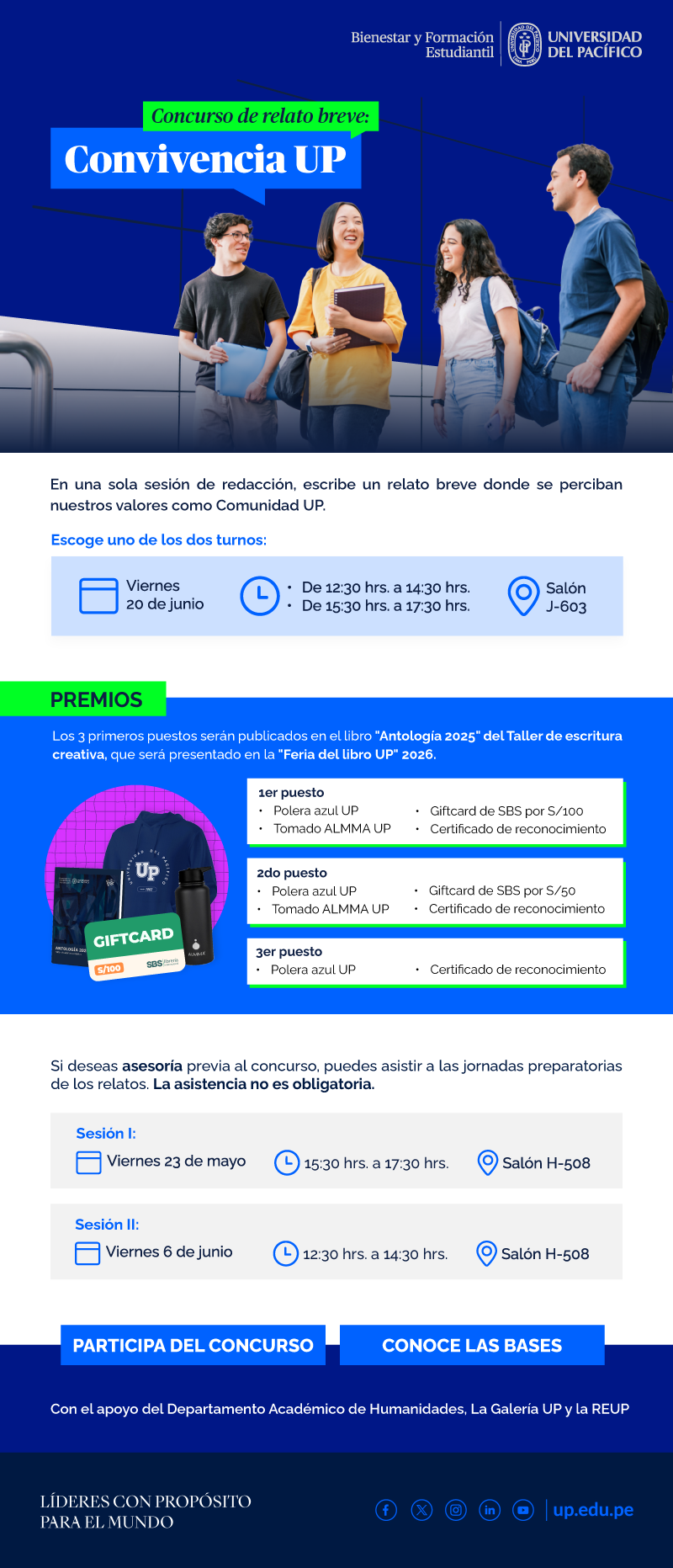 El Concurso de Relato Breve: Convivencia UP reunió a estudiantes de pregrado de la Universidad del Pacífico para reflexionar y narrar, a través de la escritura creativa, los valores que nos identifican como comunidad: Respeto al otro, Honestidad y veracidad, Libertad de pensamiento y opinión, y Responsabilidad social.