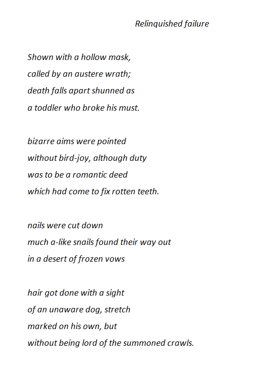 Así como es común escuchar del éxito de algunos, resultan muy escasas las veces en que el fracaso de otros es mencionado. El presente poema lo escribí al hallarme cerca de reprobar un curso al inicio de mi vida universitaria, por lo que explora las implicancias y consecuencias negativas del fracaso: desesperanza, arrepentimiento, falsas apariencias, humillación, fuerce a hacer cosas indeseadas (pérdida de la libertad), privación e impotencia.