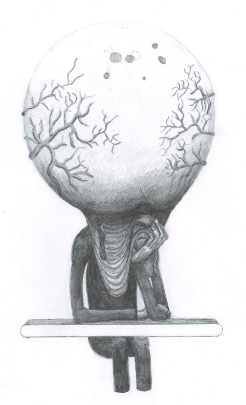 El dibujo consiste en un personaje con una cabeza muy desarrollada y pesada que parece inflamada. Su cara parece podrida, derretida, anciana, cansada, triste y desesperanzada. No goza, tiene algunos sentidos obstruidos. No tiene pies, no puede caminar solo (a).